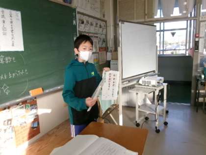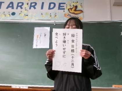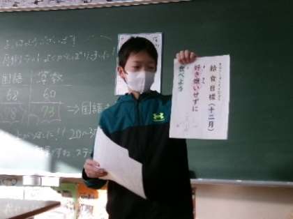 朝の会で給食委員が各学級に出向き、今月の目標「好き嫌いをせずに食べよう」の呼びかけをしていました。好き嫌いなく何でも食べられようになるといいですね。