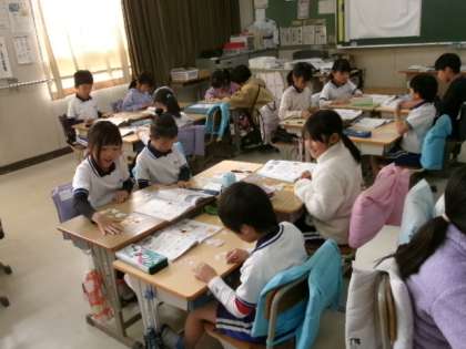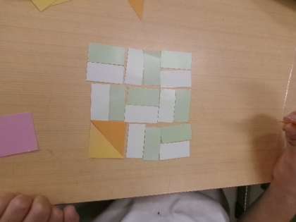 2年生が三角形と四角形でもようづくりをしていました。いろんなもようができましたね。