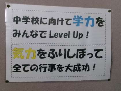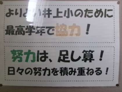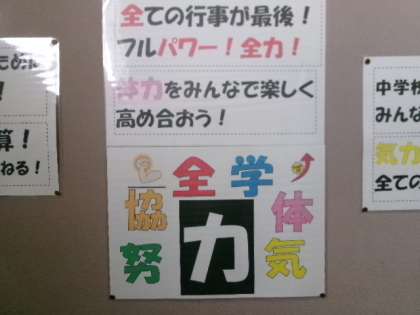 東階段2〜3階の踊り場の6年生の掲示です。「全力協力努力学力体力気力」いい目標ですね。