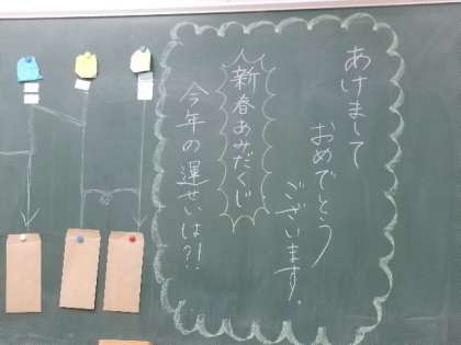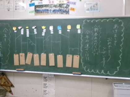3年生が「新春あみだくじ」で運だめしのおみくじをしていました。突然行ったのに、くじを引かせてもらい、見事大吉をいただきました。