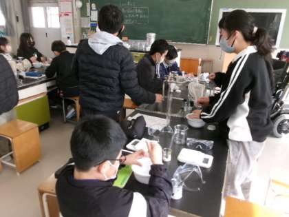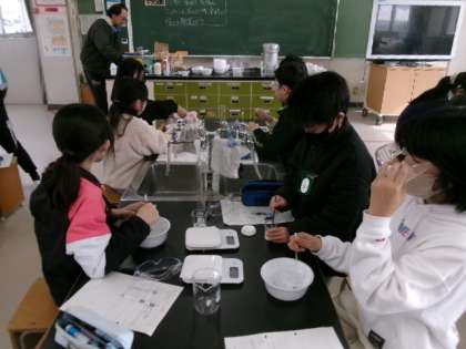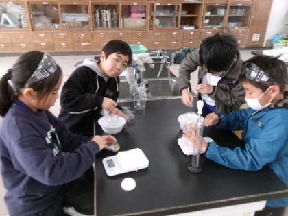 5年生が理科室で「ものの溶け方」の実験をしていました。結果は予想通りでしたか?
