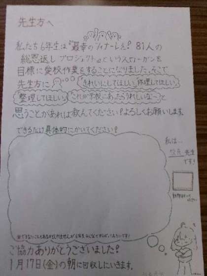 6年生が愛校作業「総恩返しプロジェクト」のアンケートを先生方に依頼していました。なにを書こうかな。