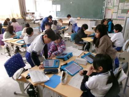 3年生「みんなにとっても良い町にしたい」発表練習です。タブレットも使うんですね。