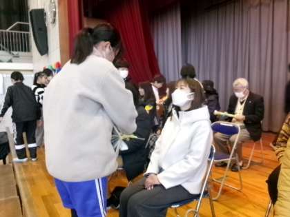 読み聞かせや図書館掲示のボランティア、交通指導員や見守りの方々などに、お礼の気持ちを込めて、手紙と花を一輪お渡ししました。