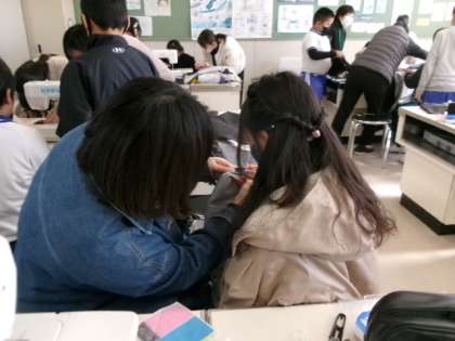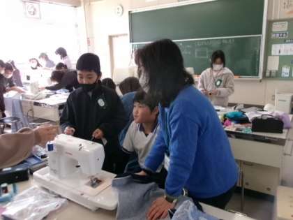 5年生のエプロンづくりに今日もたくさんのボランティアの方がお手伝いに来てくださいました。