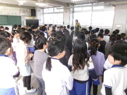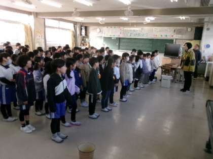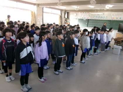2年生も音楽室で学年集会をしていました。送る会の練習ですね。