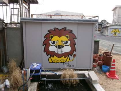 6年生が愛校作業で、メダカ池前の倉庫に、ペンキでライオンの絵を描いてくれました。トラ倉庫とゴリラ倉庫に加え、新たにライオン倉庫ができました。