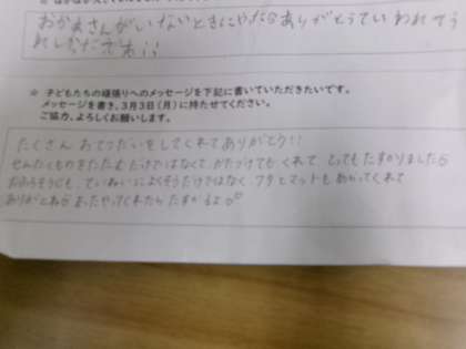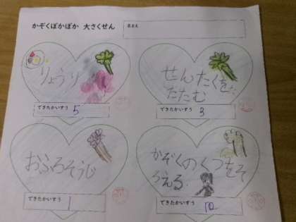 1年生が生活科で「かぞくぽかぽか大さくせん」をしました。家族が笑顔になることを考えて頑張りました。とっても成長しましたね。