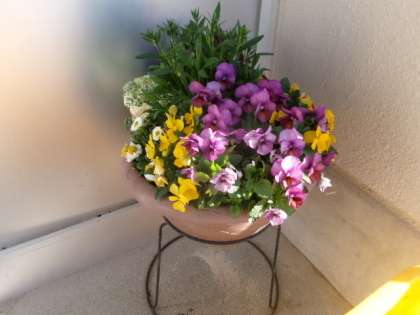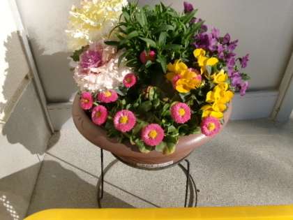 東昇降口前に、校長作の花の寄せ植えが2つあります。きれいに咲いています。ぜひご覧ください。