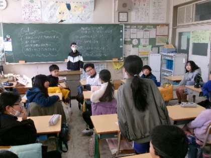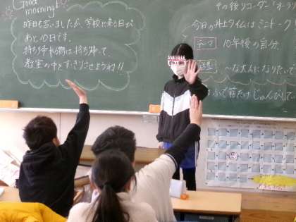 4年生が朝の会で、誕生日の子にお祝いをし、質問をしていました。メガネがいいですね。