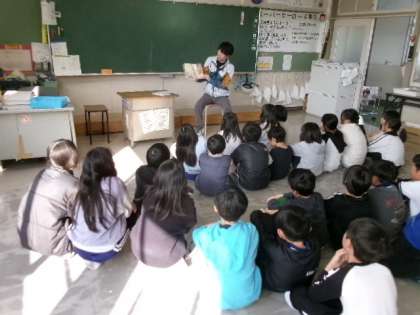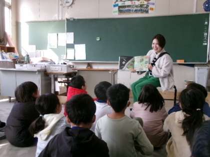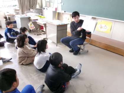 3月13日(木)朝、3年生が、担任でない学年の先生による読み聞かせをしていました。