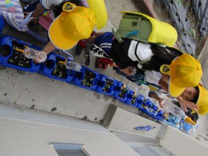 先週、播いたアサガオ、芽が出てきました。子どもたちは、「1つ出た」「4つ出た」「まだかな」と水をあげながらつぶやいていました。