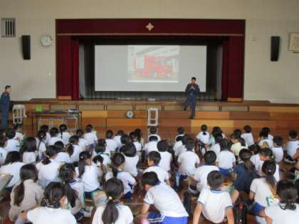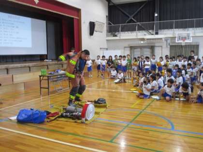 3年生は、北消防署の消防士の方に話を聞きました。消防士の一日の仕事や消防服に着替える様子を見せていただきました。また、消防車もまじかで見せていただき、どの子も目を輝かせて、見入っていました。