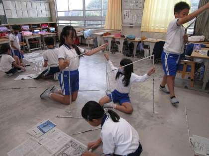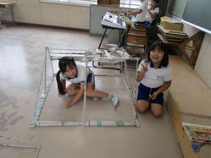 4年生は、図画工作の授業で「つなぐんぐん」という作品に挑戦しました。新聞紙を棒状にまるめ、つなぎ合わせて作品を作ります。班で協力しながら、大きな作品を作り上げていきました。自分たちが入れる家のような作品や、モニュメントのような作品も出来上がりました。