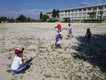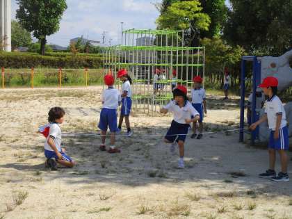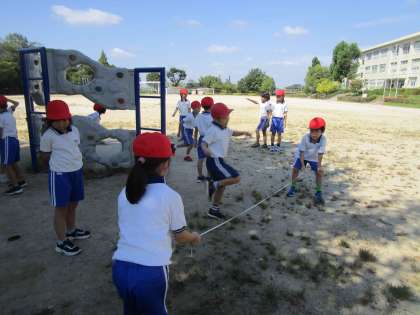 2年生は、体育の授業でゴムを使っての高跳びを行いました。どこまで高く跳べるのか、跳び方を工夫したり、助走を工夫したりし、挑戦していました。