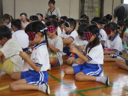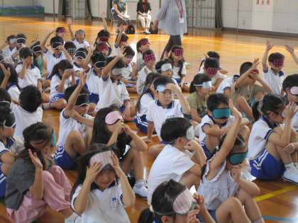 1年生は、「障がいを理解すための実践教室」を行いました。今回は、視聴覚障害者支援センターつえの里のガイドヘルパーから、視聴覚障かい者を助けるためのつえなどの道具につてのお話を聞きました。さらに、子どもたちは、アイマスクをつけて折り紙を折る活動を通して目が見えないことの体験をしました。