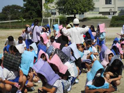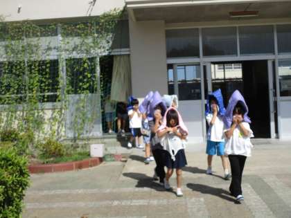 今日は、理科室から出火した火事を想定して避難訓練を行いました。煙を吸わないように口にハンカチをあてながら、素早く運動場に避難することができました。