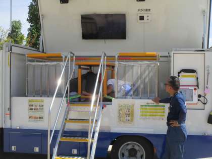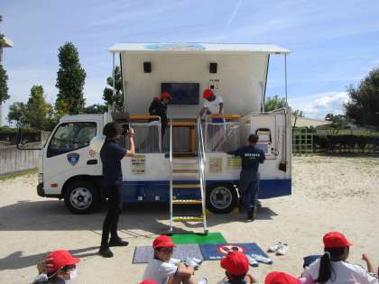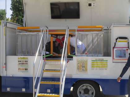 6年生は、避難訓練後、地震体験を行いました。消防本部から「防サイくん」(地震体験車)に来ていただき、震7の体験を行いました。緊急地震速報あと、机の下に身をかがめ震度7の揺れを体験しました。体を固定するのがやっとの状態でした。