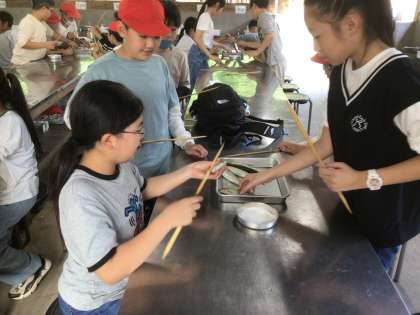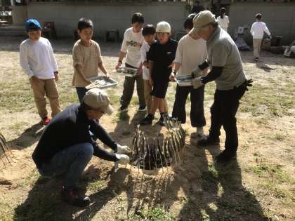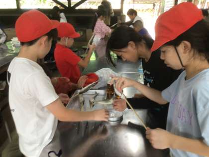 先ほど捕まえた鮎に串をうち、塩焼きにしました。はじめて魚に串をうつ子が多く、はじめはおっかなびっくりでしたが、みんな上手にできました。