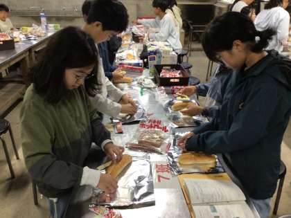 朝食は、カートンドックです。パンにチーズとソウセイジをはさんで、アルミホイルに包み、牛乳パックに入れて焼きます。子どもたちは手ぎわよく作っていました。いただきます。自分で作った朝ごはんは美味しかったようです。