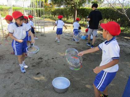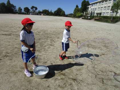 1年生は生活科の授業で、シャボン玉に挑戦しました。家庭で作っていただいた針金ハンガーの輪を使って、大きなシャボン玉を作ろうと工夫していました。大きなシャボン玉ができると歓声が上がっていました。