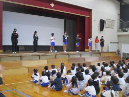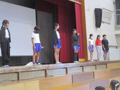 全校集会が行われました。今回は、先日活動が始まった後期委員会の委員長が、活動の抱負を発表しました。どの委員長も全校児童のために学校をよりよくしていきたいという思いのこもった抱負を発表してくれました。
