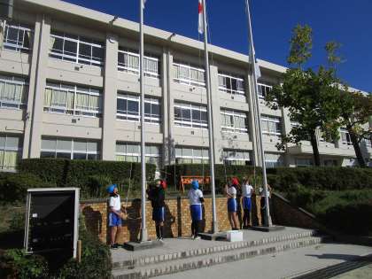 週末の開催の運動会に向け、全校で開会式・閉会式の練習を行いました。実際に応援席に座り、企画委員会の司会進行で、練習が行われました。