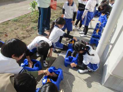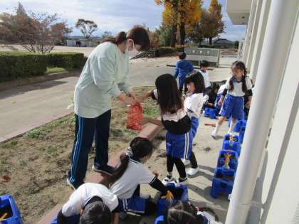 1年生は、生活科の授業でチューリップの球根を植えました。土の量を考えて入れたり、球根の植える向きを気にかけたりしながら、ていねいに植えていました。子どもたちは、春に花が咲くのが楽しみにしていましす。