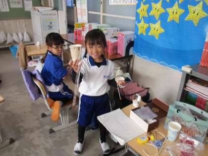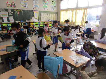 1年生は、生活科の授業でおきのおもちゃづくりをしています。拾ってきたドングリなどの木の実や色づいた葉などを使って楽しいおもちゃを考えて作りました。