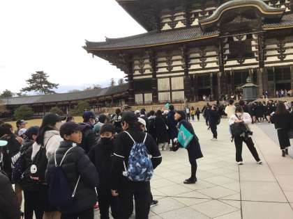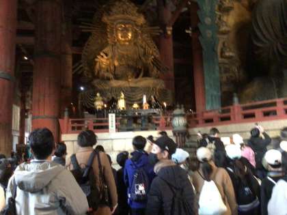 東大寺大仏殿を見学しました。大仏殿の大きさにびっくりしましたが、最初に作られた大仏殿は二周り大きかったそです。中に入ると、大仏の大きさにまたびっくりでした。この後、奈良公園の班別行動です。