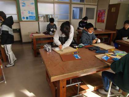 5年生は、図工の授業で、スプーンづくりをしています。これは、社会科での林業の授業と関連したものです。ヒノキ材からスプーンを削り出しています。けがき線に合わせて削ることがどれだけ難しいかを感じながら行っています。どのようなスプーンが出来上がるか楽しみです。