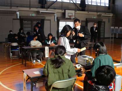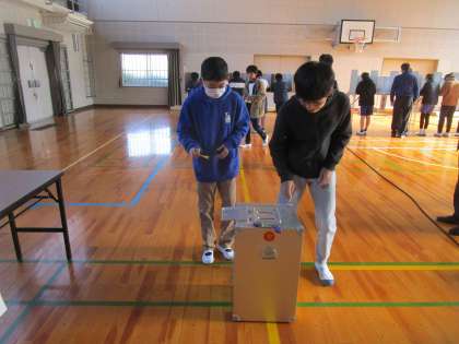 6年生は、豊田市選挙管理委員会の選挙出前授業を受けました。選挙の大切さを学んだ後に、模擬選挙(投票)を行いました。本物と同じ機材や投票用紙使い、模擬投票を行いました。選挙を公平に行うための仕組みや選挙の大切さを感じることができました。