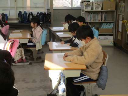2年生が、書き初めの練習に取り組んでいました。1・2年生は硬筆による書き初めです。一字一字ていねいに書く様子が見られました。1月7日には、書き初め大会が行われます。