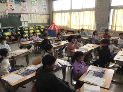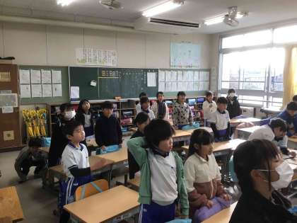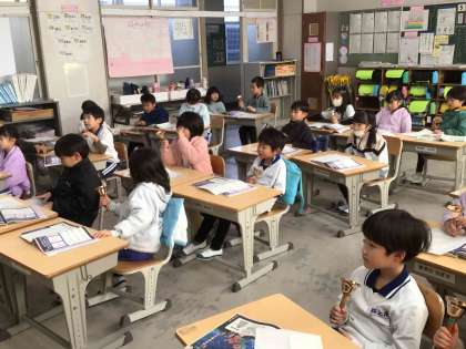 1年生は音楽の授業で、ハンドベルに挑戦しました。音階のベルを1つもち、曲に合わせて自分のもっている音階のベルを鳴らしていました。