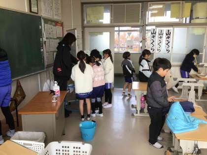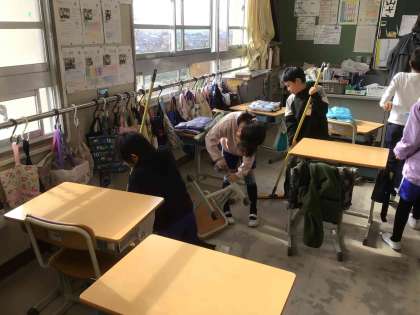3年生は、教室の大掃除をしていました。明日から冬休みになるので、普段の掃除ではなかなかできない机や椅子の脚を拭いたりし、みんなで教室中をきれいにしていました。