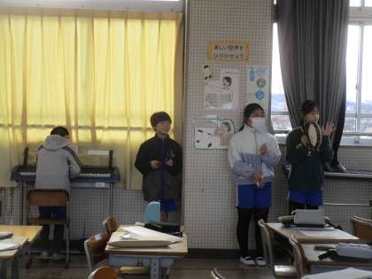 5年生は、音楽の授業で「曲想を生かして合唱しましょう」ということで、「キリマンジャロ」をリコーダーやキーボード、打楽器で合奏しました。指揮者に合わせて素晴らしい演奏でした。