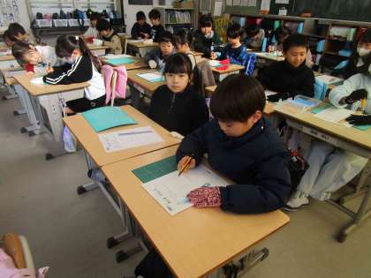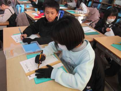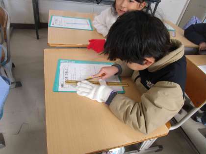 2年生は図工の授業でカッターナイフの使い方を学びました。決められた線に定規をあて、はじめは恐る恐るカッターナイフで切る様子が見られました。