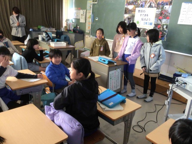 3年生の学習発表会では豊田のすてきを伝えようと題して、総合的な学習に時間で、見学に行った地域や市中心地の施設などを班ごとに紹介しました。パワーポイントを上手に使い3年生らしい発表でした。また、クイズもあり、参観の方を悩ませるる難しい問題もありました。