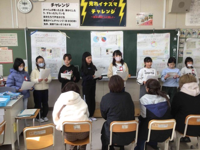 4年生の学習発表会では、はじめに学年で歌を披露しました。そのあと各学級で「地球の未来を考える活動報告会」として、自分たちでもできる環境を守るための活動を発表しました。調べたことや実際に行ったことをもとに発表しました。また、「十歳の決意」も一人一人が発表していました。