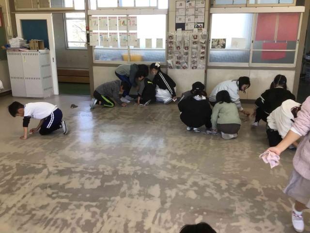 1年生、4年生、6年生は、1年間使った教室の大掃除をしました。机などをすべて出して、床の掃き掃除や、拭き掃除を行いました。1年間お世話になった教室を隅々まできれいにしていました。