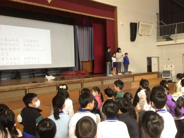今年度最後の全校集が行われました。4年生から「服プロジェクト」での協力のお礼と、集められた服がシリアの子どもたちに届けられたという報告がありました。6年生からは、劇であいさつ運動の啓発がありました。最後に元気よく校歌を歌いました。1年生から6年生までがそろうのは、これが最後です。