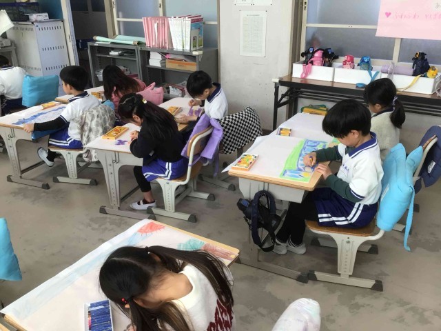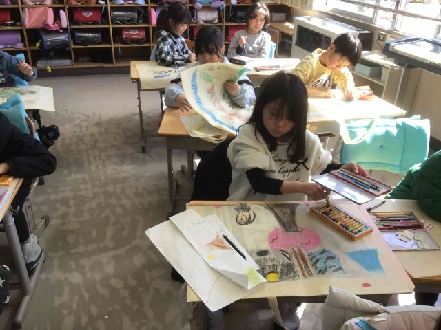 各学年では、図画工作の授業で描いた絵や習字の作品を持ち帰っていました。作品を見ながら、「こんなことをやった」、「たのしかった」と思い出を話している子も多くいました。1,2年生は、作品を持ち帰るための作品バックに、思い思いの絵を描いていました。