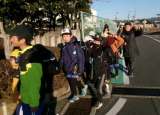 1月30日(火)登校(正門前)の様子です。元気なあいさつ、2列歩行、手上げ横断...