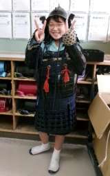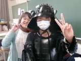 6年生が博物館からお借りした甲冑と鉄砲を身に着けていました。