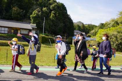 家庭訪問の代わりに、「地域訪問」を実施しています。学区を回り、各家庭の場所を確認しながら、通学路の危険箇所の把握もしています。