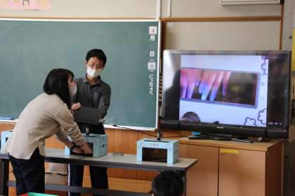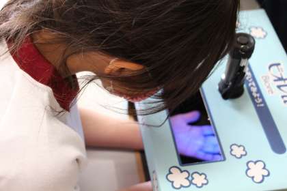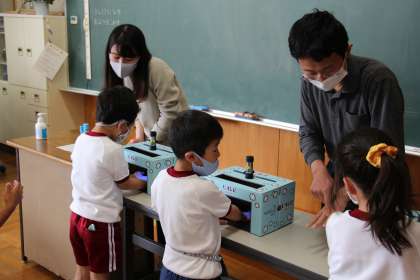 手洗い指導 公開日 2021/04/27 更新日 2021/04/27 お知らせ コロナウイルス対策の一番大切なことは、手洗いです。ウイルスを体に入れないためには、正しい手洗いの方法を知ることが大切です。本日、1年生が養護教諭にも力を借りて、正しい手洗いの仕方を学びました。 いつもの手洗い後、ブラックライトに当てるとばい菌の部分が浮き上がり、普段の手洗いでは十分ではないことを知りました。自分の目で確かめたことで、積極的に手を洗う意識を高めました。