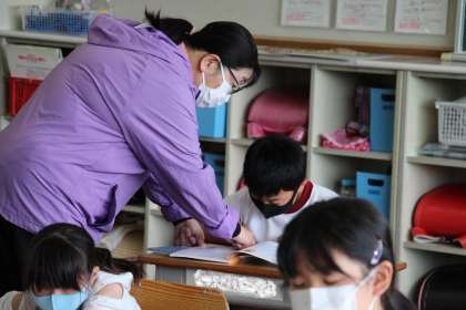 静かに集中している授業風景です。4年生は算数です。ノートに方眼の表を貼り取り組んでいました。5年生は書写です。正しい姿勢で静かに集中して行っていました。6年生は、国語の単元テストでした。普段は明るく元気な6年生ですが、今日は真剣そのものでした。