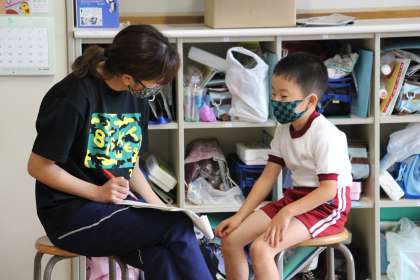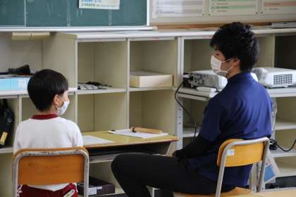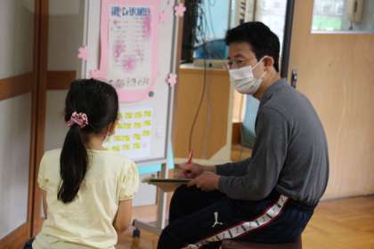 1〜3年生の教育相談の様子です。本日は、他の児童が教室で活動したため、特別教室等を使って行いました。
