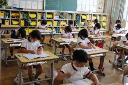 今日の様子2 公開日 2021/05/31 更新日 2021/05/31 お知らせ 授業の様子です。1年生は、書写(かきかた)です。いい姿勢からは美しい字が書けることが分かります。3年生では、オリジナルの地図記号を考えようで盛り上がっていました。知識を覚えるも大切ですが、こういうことが力になると思います。 6年生は、卒業アルバムの個人写真を撮影していました。各自が思い入れのあるものをもったり、衣装を身に付けたりして、渾身の1枚を撮ってもらいました。