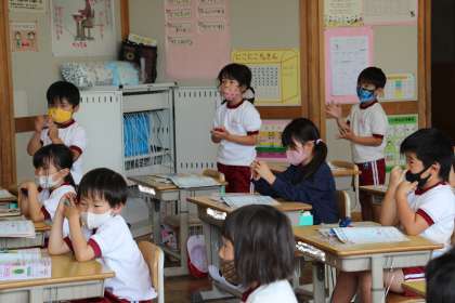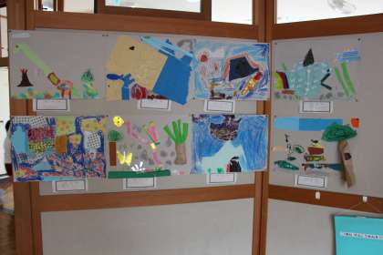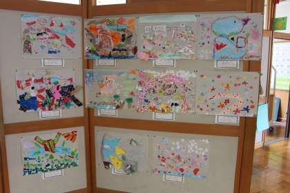 1年生の音楽のカスタネット演奏と図工の作品です。